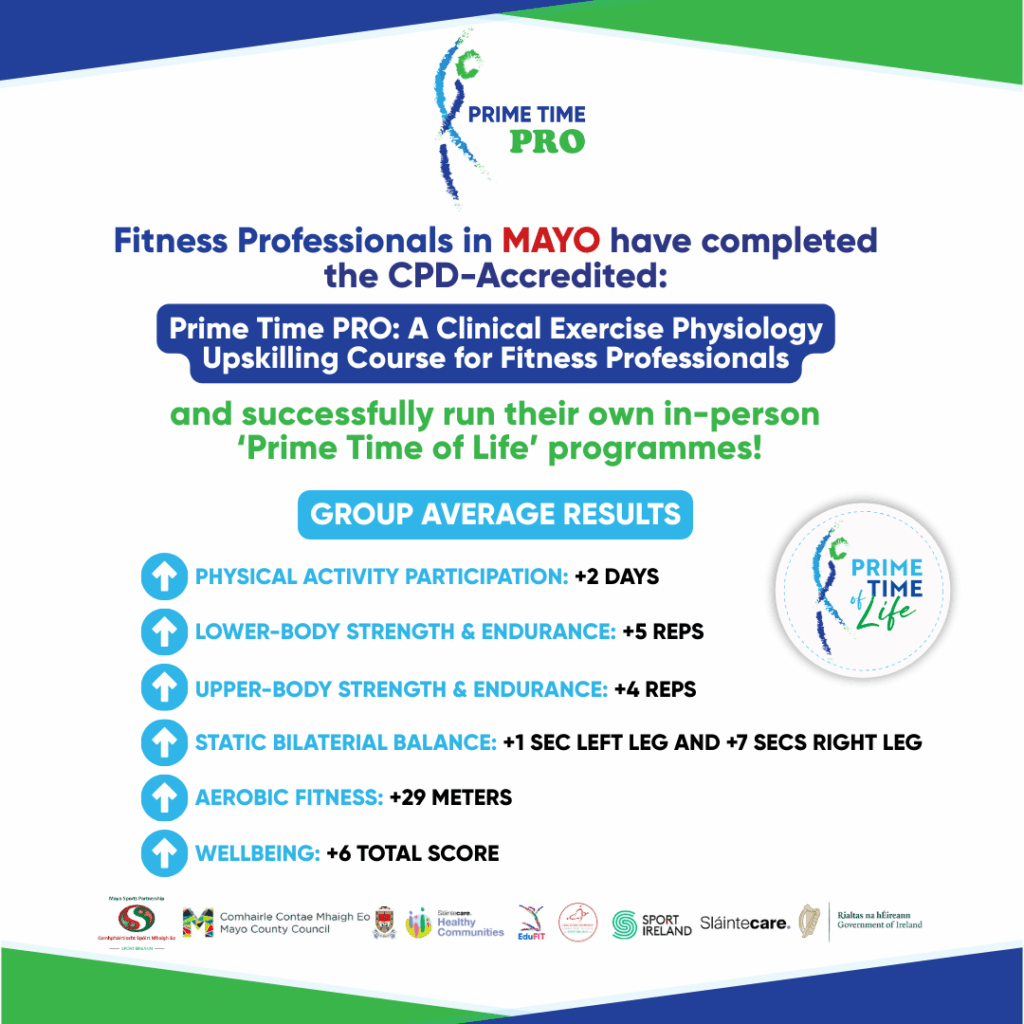 We would like to say a huge well done to Mayo Sports Partnership who have finished running their second ‘Prime Time of Life’ programme, with instructors Edel O’Malley (Physical Activity for Health Officer for Mayo Sports Partnership) and Justin Healy who previously completed our ‘Prime Time PRO’ CPD-accredited training.