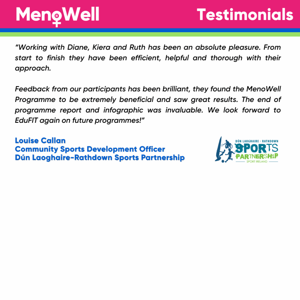 For 20 years, we have designed, implemented, and evaluated evidence-based health, fitness, nutrition, and wellness programs across academia, research, industry, and the community. Most of our programs in Ireland have been funded by Local Sports Partnerships, Healthy Ireland, Sláintecare, Sport Ireland, Pobal, and others.