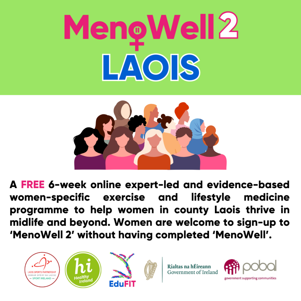 The ‘MenoWell 2 Laois’ programme is designed and delivered by EduFIT and is funded by Healthy Ireland, the Government of Ireland, Pobal and Laois Sports Partnership. If you have any questions, please contact us by email on programmes@edufit.ie.