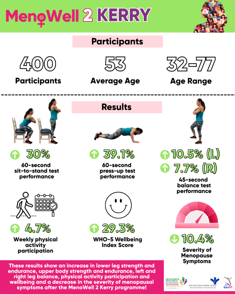 The ‘MenoWell 2 Kerry’ programme was designed and delivered by EduFIT and was funded and supported by (KRSP) Kerry Recreation and Sports Partnership and Bon Secours Hospital Tralee.