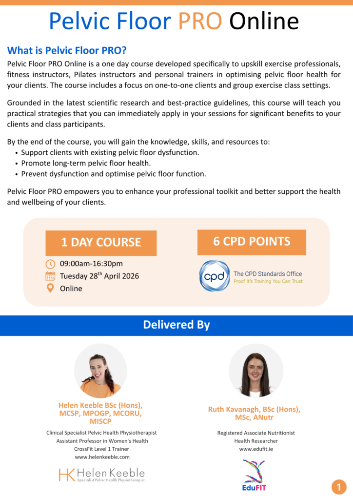 By registering for Pelvic Floor PRO Online, you are providing your information to EduFIT. All personal data will be stored and handled by EduFIT in compliance with General Data Protection Regulation (GDPR) guidelines for the duration of the course (until your CPD certificate has been issued). Our privacy policy can be viewed at www.edufit.ie/privacy-policy/