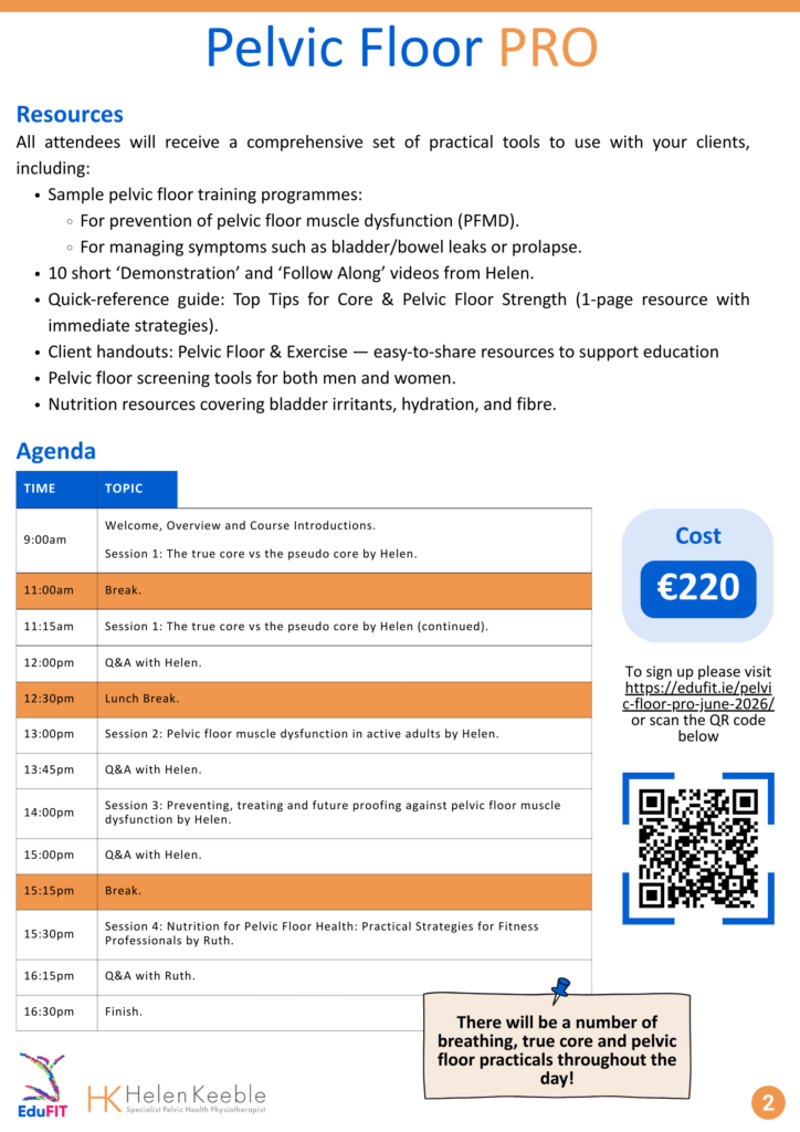 Pelvic Floor PRO Portlaoise is a one day course developed specifically to upskill exercise professionals, fitness instructors, Pilates instructors and personal trainers in optimising pelvic floor health for your clients. The course will be delivered in Portlaoise on Saturday 13th June and includes a focus on one-to-one clients and group exercise class settings.