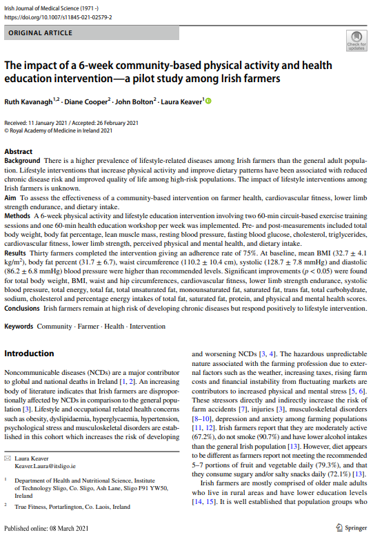 Ruth Kavanagh ANutr was successful in her application to the Irish Research Council. Ruth received an employment based masters in partnership with True Fitness (Dr Diane Cooper was the employment based mentor) and the Institute of Technology Sligo. The focus of Ruth’s MSc research was to determine the impact of a 6-week community-based lifestyle education and physical activity programme on the dietary intake, physical, cardiovascular and metabolic health of farmers living in Ireland.