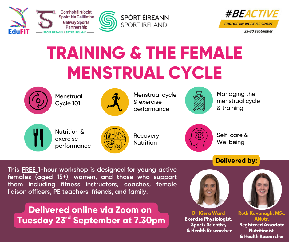 EduFIT, in partnership with Galway Sports Partnership and Sport Ireland, are delighted to invite you to this FREE 60-minute online evidence-based health education masterclass on ‘Training & The Female Menstrual Cycle’ with Dr Kiera Ward (Exercise Physiologist, Sports Scientist, and Health Researcher) and Ruth Kavanagh, MSc. ANutr (Registered Associate Nutritionist and Health Researcher).